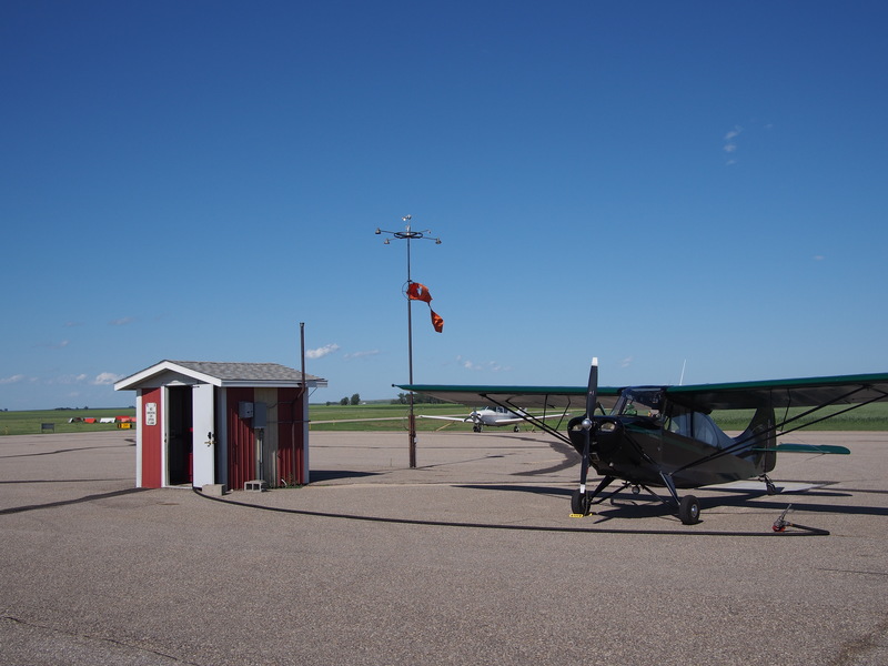The landing at Harvey was actually pretty exciting. The same 20-30 knot wind that had been present straight down the runway at Minot was now 30° off the runway, making for a pretty substantial, and variable, crosswind. Even so, I managed to land in one try, and the airplane didn't even flip over despite the wind's best efforts. One thing I don't appreciate about the Champ is how the control stick cannot be moved to the full aft and full left or full right positions -- my legs are in the way, and there's no way to get them far enough out of the way to reach the stops. This makes crosswind landings more exciting than they need to be, since the ailerons (roll controls) are important for dealing with crosswinds. The upwind wing lifted as I was taxiing down the runway at Harvey, and had the gust been stronger, the plane might well have flipped. This is also a fine reminder that you really have to fly the plane until it's tied down. The flight controls were definitely all in play as I taxied to the fuel pump.