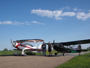 After a breakfast at Harriman's (of course), we gathered my stuff from the Grand Prairie Inn and pulled both planes out for a staged glory shot in the low-slanting morning light. I thanked Bob for all his time and effort ferrying me around North Dakota, we shook hands, and I was off.