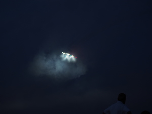 Night airshow: a flight of four with an interesting light show, flying through their smoke trail