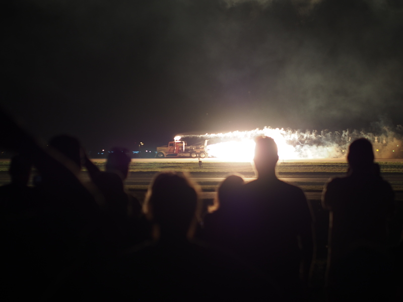 The show was fine, but it reminded me that I'm really just not much of an airshow person. The most impressive thing was also the most martial thing: an F-22 fighter jet which blew past multiple times with the afterburners on, basically just a monumentally expensive bass drum, but it got the crowd good and riled up. As it got darker, the acts got more interesting, with one act being a quartet of planes that flew in close formation trailing smoke with a light shining back from the tail, so it looked like they were flying in rocket-powered planes even though they were plainly piston prop planes. They had very bright lights so that occasionally they would pass through their own smoke trails and light them up impressively.