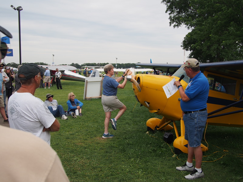 The next event on my list was a hand-propping demo. This is where you carefully set up the plane so it's restrained, get in front of it, and swing the propeller to start the engine. Absolutely normal on a 7AC Champ, which has no electrical system, thus no self-starter. My 7EC Champ fortunately has an electrical system and a starter, so I don't need to know how to do this, but it could come in handy at some point. If I accidentally leave the master switch on and drain the battery, I can still start the engine, which is pretty cool.