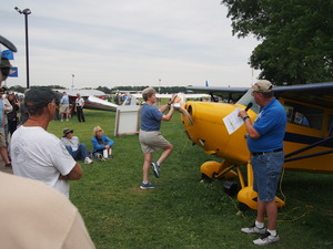 The demo was given by a husband and wife team, and was pretty clear. He laid out all the dos and don'ts of the procedure, and showed us some good ways to make it safer. A common problem is that someone will start a plane and for one of a variety of reasons the plane gets away from them. It can then crash into hangars, cars, other airplanes, etc. It's not hard to find photos of "grated" airplane tails where a runaway plane has sliced progressively into another airplane's tail before coming to a million-dollar stop. I liked his idea to use a bungee cord to pull back on the throttle in a plane like the Champ, with a little wedge that can be inserted to crack the throttle for starting (though I think Norbert might start without any throttle at all; I'll have to give it a try on the return flight -- try the throttle part, not the hand-propping part).