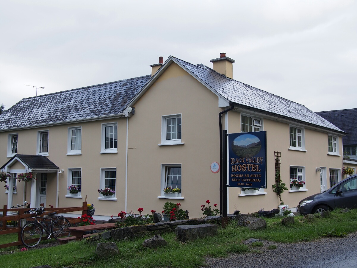 Once I got the bike all sorted out at Motofeirme, I headed out. Of course, it's never that easy, and so I didn't actually leave on Saturday until 2 pm. There was a lot of to and fro getting bags in order, packing stuff, dealing with last minute emails and research before the wifi went away, and taking our picture with Barry, the Other Australian. He had just bought a Yamaha Tenere, and was running around doing what I'd done the day before with my bike. Finally, though, I got on the bike, and took my first wobbly steps with the massive load strapped to the back. Martin had recommended that I stay that night at the Black Valley Hostel near Killarney. I looked up their website, and plotted out a route that took me along the coast, away from the main roads. I had vaguely in mind that I wanted to visit Mizen Head, which (as I guessed, and later confirmed) is the southwest-most point in Ireland. The bike was a bit ponderous with its load, but not enough to be problematic. It had, surprisingly, no real bad habits, and once I sorted out how to secure my load I was happily rolling along. The Irish roads, both on that day and subsequent days, proved to be narrow, twisty, and bordered by stone walls or hedges (which apparently contain stone walls at their leafy heart). With the exception of today's run on the motorway, I have simply not been bored or disengaged while riding in Ireland. It's a wonderful change. The roads in the US are very safe, with wide lanes, shallow curves, and generous sightlines. This is arguably good, but it also makes them boring. Boring, boring, boring. It's one of the things that I noticed in New Zealand nearly a decade ago as well: the roads are narrow and twisty and interesting. If you are bored or half asleep, you're going to get in trouble quickly. There's a constant sense of engagement in the process which is utterly lacking in my experience of (mostly West Coast) US driving. I imagine it's also quite tiring when all you want to do is get from point A to point B as efficiently as possible, of course. I aimed the bike generally westward, and set off. I was aiming for Mizen Head first. Quite early on, I decided to turn off the GPS's routing function. I didn't want to be directed where to go, since I didn't have a destination I had to be at. I didn't like the dictation of where to go, and I'd realized riding around Cork and Kinsale that I was keeping my head down, seeing the GPS and the road, rather than keeping my eyes out to the greater world, including the signs that more than adequately described where I needed to go. I kept seeing these breathtaking views, and having to pull off to the side of the road to take a picture. It actually slowed me down pretty considerably at first. You literally can't go over a rise in Ireland without seeing a new beautiful sight. Rolling hills, fields bordered by hedges or low stone walls, beautiful white houses with immaculate yards (seriously, I have not yet seen an Irish house that wasn't either new-looking or actually an old stone ruin). There are fields full of cows, or sheep, or horses. I eventually had to stop stopping for pictures, simply because I needed to make forward progress before it got too late. I stopped in a town called Schull, the name of which I was a touch disappointed by -- on my Michelin map, it's spelled Skull, and I was looking forward to getting a picture of myself with the sign saying Skull on it. Undaunted by Michelin's inability to spell, I got a picture with the sign anyway. One thing that's interesting is that all the signs in Ireland, and I mean all the signs, have both English and Gaelic on them. I'm probably ruining my Scots Gaelic with all this Irish, but it's pretty cool to see. I hope Scotland is doing something similar (although it's clear that Ireland has been doing this for decades). I now know the Irish Gaelic for a variety of traffic signs, and it's fun to sound out the Gaelic for the different town names -- most have both Irish and English, and some have only Irish. Cork, for instance, is Corrcaidh (which sounds out as "COR-key," at least in Scots Gaelic). I finally made it to Mizen Head, after a couple of missed turns (I got really good at finding the next driveway and executing a thing like a U-turn that wasn't actually a U-turn -- the roads are generally too narrow to turn a bike around in; ponder a motorcycle's turning radius, and think about that one for a minute). Unbeknownst to me, Mizen Head is also a signaling station, presumably for ships at sea, so my first sight of it was giant antennas. There was a visitor's center, which was closed by the time I got there at 6. There was also a gigantic ship's propeller, recovered from the wreck of a steam ship that sank nearby in the early 1900s -- 9 tons of brass, with nuts bigger than my fist. I turned myself around, and headed back along the road through Schull (or "an Scoil" in Gaelic), and on towards Killdare. The road I took went over Cara Pass, where it got cold, and beautiful, and twisty-roaded like I hadn't seen before. I was having to take half the corners and switchbacks at 30 km/h (around 20 MPH), they were so tight. This is on N71, which is a national secondary road. I can't imagine how the giant lorries get through that road (although perhaps they just don't drive it). I passed through Killdare, and to Beaufort, where the hostel's website said its address was. This turned out to be one of those postal fallacies. In actual fact, I was at the north end of the Gap of Dunloe, a fantastically beautiful valley with steep slopes, a couple of amazing lakes, and a single-lane, 20-30 km/h road. I had been eyeing gas stations as I went, unsure of exactly what kind of fuel efficiency I was going to get (my first fill-up had come out to 14.1 km/l, or about 200 km on the trip odometer before I needed to start looking for fuel, with 250 as more or less the "falls over dead" point). My trip odometer was just rolling past 220 as I turned toward Beau