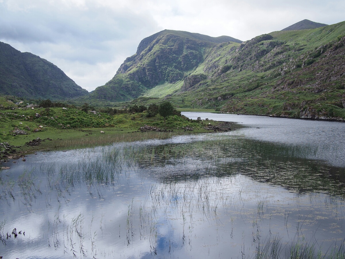 The hostel turned out to be in the finest tradition of marginal hostels everywhere, and I wound up on a narrow, drooping bunkbed in a room with 10 other gents, the first of whom I met implored me in German to turn the light on if I wanted, when I first walked in. The kitchen was sized for 20 backpackers at once, and was the scene of my first experience with wheaten bread, which resembles pumpernickel, but with a distinctive and delicious flavor largely unlike pumpernickel. I had some slices of Dubliner white cheddar (the medium-priced of the sliced cheeses), and a tomato, and made up my dinner at nearly 11 pm that night. The following morning, after a sleep noticeably less comfortable than I'd had on my sleeping pad at Motofeirme, I got myself up and planned out my day using the hostel's very slow (but present, and thus invaluable) wifi. I didn't want a long day like the day before, so I set my sights close: Adare, just outside of Limerick. The way out from the hostel, unlike the way in, was stunningly beautiful, and in the daylight, not daunting at all. Unfortunately, when I started the bike at the hostel, the fuel light was blinking, which it had not been on the way in. I suspected that this was because the bike was pointed uphill from the moment it was parked, although I wasn't willing to waste time and gas pointing downhill to find out. I stopped after a switchback or two to check through the user's manual, since I realized that I didn't know what "blinking fuel light" actually meant. Ah, there we go: 3.5 liters of fuel, and if it goes solid, there are 1.5 liters left. Well, that was encouraging, at least. I dialled up the next town (Killorglin), and it was only 23 km away -- less than 2 liters of fuel based on the one data point I had, and the tank likely had at least 3.5. Cutting it close, but it would be feasible. As I rode out the Gap of Dunloe (as I had strongly suspected I would do), I stopped about every five minutes to take another set of pictures. First it was at the head of the valley, then at a lovely set of stone bridges, then again at one lake, and another lake. I also grabbed some shots of the horses and carts which were making their way (generating the dung), laden with tourists, up the narrow road. There were even some animals which were either very wooly goats, or comparatively intelligent-looking sheep which fell prey to the lens.