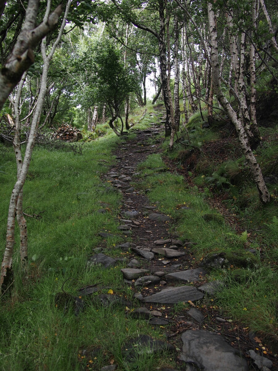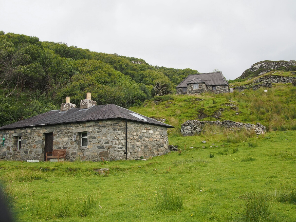 Today started very pleasantly, at the Lodge B&B, in a nice warm bed, sending emails. The included breakfast was ridiculously comprehensive, including yogurt, cereal, fruit, juice, tea, eggs, veggie sausage (the owners, Catherine and Robert, are vegetarian!), toast, fried tomatoes, mushrooms, spinach, zucchini (courgette, I was assured it is called here), waffles, and I'm probably forgetting other stuff. I took pictures, it was so ridiculously delightful. Unfortunately, that was the end of the delight for a while. When I looked outside, it was to the sight of small drops of rain falling in great quantity on the bike. And all indications were that it wasn't going to stop. So, I packed up my stuff and strapped it to the bike with a certain amount of regret. I convinced Catherine to pose for a picture, paid the bill, and headed out in a moment of brighter light that we'll charitably call sunshine. I continued along the road, toward Glenuig. (A correction from yesterday's note: the "little houses" were actually called the Taighean Beaga, not Beagan.) I didn't want to stop for pictures, since there was so much water falling out of the sky. It was after only about five minutes that I felt the first trickle of rainwater running down my leg. The riding suit is ok for moderate rain, but in a real shower, it leaks quite consistently at the crotch. The rain proceeded to get harder and harder. As I made the turn for Mallaig (the nearest big town to Glenuig), it started raining harder. 10 miles along the road to Mallaig, it was raining even harder. I was hunched over the tank bag, hoping to prevent some amount of water from running down my front and thus inside the suit. I am generally far happier to be riding a bike without a fairing, but in moments like this, the weather protection would be awfully nice. The turnoff for Glenuig finally appeared, and I headed down the road toward I knew not what. I had a very clear mental picture of what the village looked like, although it turned out to have been drifting with time, and wasn't terribly accurate. I remembered some of it, but much of it was different from what my memory describes. When I spent my year in Edinburgh, I learned Scottish Gaelic from a professor who had grown up in Glenuig, speaking Gaelic. He brought his students back once a year, for those who were interested, and I took the trip with him. I wish I could remember his name, but I haven't a clue what it was now. In any case, I visited Glenuig then, with the student group, and then Brooke and I returned at Easter to stay a night or two at the Inn. When Brooke and I were there, we were eating dinner at the Inn, and unbidden and unexpectedly, musicians started showing up, and just started playing for their own enjoyment. We got a free and authentic Celtic music concert just because of where we happened to be. It was amazing. In any case, I found the shop (now open from 2-4 pm most days, closed Wednesdays -- I recalled it only being open on Tuesdays and Thursdays) exactly where I'd remembered it, and the road out of town was as I recalled it, but there were more houses around than I'd bothered to remember (I think they were there all along, but I was choosing to remember the place as being more isolated than it actually is). The Inn was much as I'd remembered it, although the rooms off to the left were connected, and I vaguely recalled them being a series of tiny cabins. I didn't actually stop in to the Inn, at first. First, I wanted to go to Smirisary, which is a miniscule fishing village directly west of Glenuig. This was where I recall Brooke taking a cool picture of me in sunset light, with these amazing upthrusting stones in the background. I really wanted to find the place again. The village itself (more properly a collection of perhaps half a dozen cottages) is only accessible by a half-mile-long footpath which, when I finally traversed it, was acting the part of ersatz streambed and mud factory as well. Before I went down, I actually climbed to the top of a small hill near the parking spot I'd picked, and just kind of looked around. The rain had tapered off, and it was very nearly not raining at this point. The view was barren and beautiful and a little bit like something from a dream. I had built up Glenuig and Smirisary as this kind of highlands nirvana in my head, and seeing it again for real was like walking into a dreamscape formed into actual landscape. I debated, and actually had my helmet on, ready to ride away, before I realized I was being silly, and I hadn't come all this way to avoid the short walk to the village -- I didn't see the path, and was feeling out of sorts between the rain and the weird emotions hovering at the edge of consciousness. I had been moments away from riding away dejectedly, convinced that it was a bad idea to spend the extra five minutes finding the footpath to the village. Fortunately, I did realize I was being silly, and grabbed the camera and tripod, and started walking. Luck was with me, and there was a gent loading his car, who directed me to the path; I started up. The path is like something out of a fairy tale, reinforced with stones to provide somewhere to step in the mud, doubtless that reinforcement put in place hundreds of years ago. It winds through a forest that I can only describe as a fairy glen (hopefully I'm caught up with pictures by the time I send this, so you can see what I'm talking about). The path opens into the field which makes up the village next to one of the cottages, a tiny stone building, maybe 200 square feet. From there, you're free to wander down through a field full of sheep and a few tents, as there are no set paths. Through a large section of tall grass, to another field, down past another cottage (this one occupied, with the residents studiously ignoring me through their glassed-in porch), to a beach made up of large stones, ranging in size from a clenched fist to a large loaf of bread. There, beside the stone bea