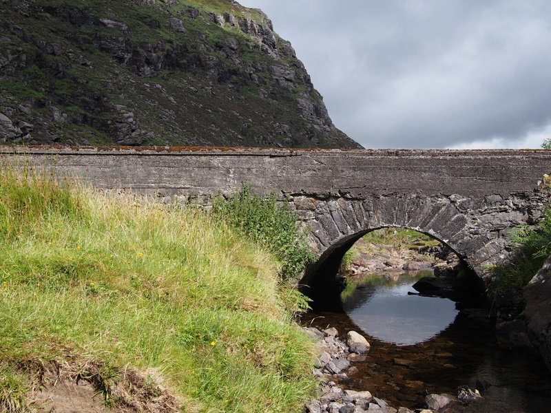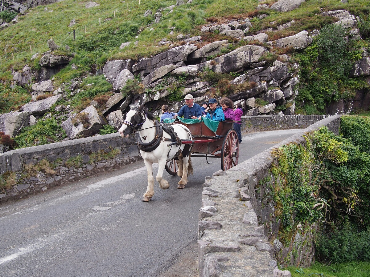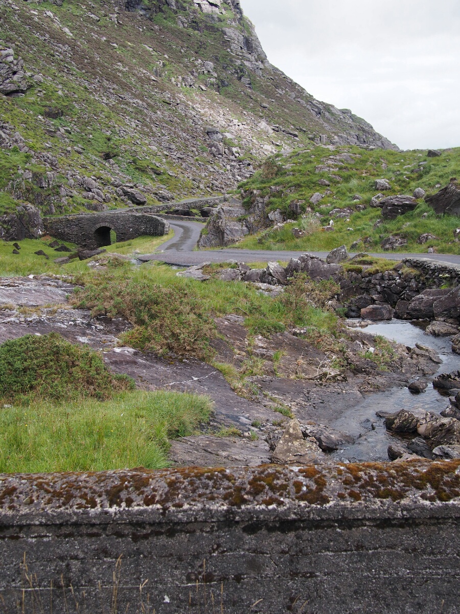The hostel turned out to be in the finest tradition of marginal hostels everywhere, and I wound up on a narrow, drooping bunkbed in a room with 10 other gents, the first of whom I met implored me in German to turn the light on if I wanted, when I first walked in. The kitchen was sized for 20 backpackers at once, and was the scene of my first experience with wheaten bread, which resembles pumpernickel, but with a distinctive and delicious flavor largely unlike pumpernickel. I had some slices of Dubliner white cheddar (the medium-priced of the sliced cheeses), and a tomato, and made up my dinner at nearly 11 pm that night. The following morning, after a sleep noticeably less comfortable than I'd had on my sleeping pad at Motofeirme, I got myself up and planned out my day using the hostel's very slow (but present, and thus invaluable) wifi. I didn't want a long day like the day before, so I set my sights close: Adare, just outside of Limerick. The way out from the hostel, unlike the way in, was stunningly beautiful, and in the daylight, not daunting at all. Unfortunately, when I started the bike at the hostel, the fuel light was blinking, which it had not been on the way in. I suspected that this was because the bike was pointed uphill from the moment it was parked, although I wasn't willing to waste time and gas pointing downhill to find out. I stopped after a switchback or two to check through the user's manual, since I realized that I didn't know what "blinking fuel light" actually meant. Ah, there we go: 3.5 liters of fuel, and if it goes solid, there are 1.5 liters left. Well, that was encouraging, at least. I dialled up the next town (Killorglin), and it was only 23 km away -- less than 2 liters of fuel based on the one data point I had, and the tank likely had at least 3.5. Cutting it close, but it would be feasible. As I rode out the Gap of Dunloe (as I had strongly suspected I would do), I stopped about every five minutes to take another set of pictures. First it was at the head of the valley, then at a lovely set of stone bridges, then again at one lake, and another lake. I also grabbed some shots of the horses and carts which were making their way (generating the dung), laden with tourists, up the narrow road. There were even some animals which were either very wooly goats, or comparatively intelligent-looking sheep which fell prey to the lens.