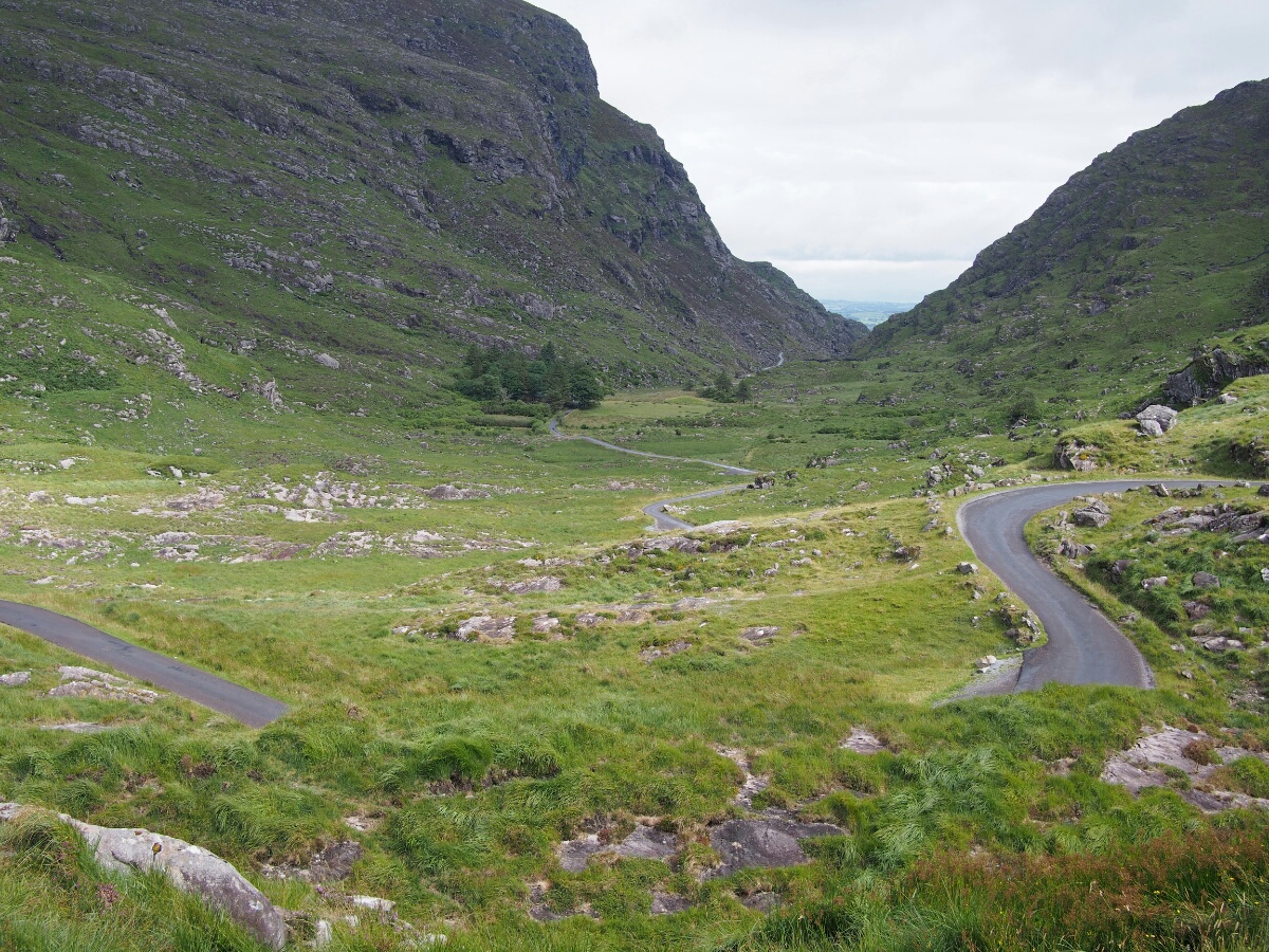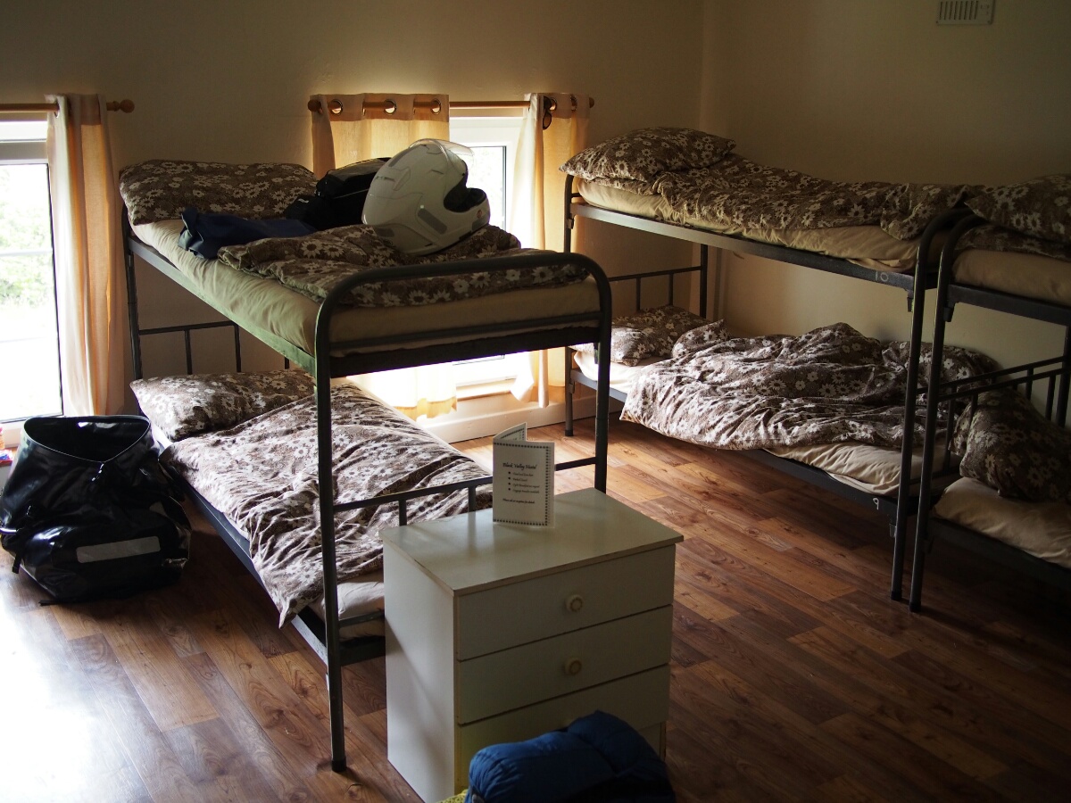 Once I got the bike all sorted out at Motofeirme, I headed out. Of course, it's never that easy, and so I didn't actually leave on Saturday until 2 pm. There was a lot of to and fro getting bags in order, packing stuff, dealing with last minute emails and research before the wifi went away, and taking our picture with Barry, the Other Australian. He had just bought a Yamaha Tenere, and was running around doing what I'd done the day before with my bike. Finally, though, I got on the bike, and took my first wobbly steps with the massive load strapped to the back. Martin had recommended that I stay that night at the Black Valley Hostel near Killarney. I looked up their website, and plotted out a route that took me along the coast, away from the main roads. I had vaguely in mind that I wanted to visit Mizen Head, which (as I guessed, and later confirmed) is the southwest-most point in Ireland. The bike was a bit ponderous with its load, but not enough to be problematic. It had, surprisingly, no real bad habits, and once I sorted out how to secure my load I was happily rolling along. The Irish roads, both on that day and subsequent days, proved to be narrow, twisty, and bordered by stone walls or hedges (which apparently contain stone walls at their leafy heart). With the exception of today's run on the motorway, I have simply not been bored or disengaged while riding in Ireland. It's a wonderful change. The roads in the US are very safe, with wide lanes, shallow curves, and generous sightlines. This is arguably good, but it also makes them boring. Boring, boring, boring. It's one of the things that I noticed in New Zealand nearly a decade ago as well: the roads are narrow and twisty and interesting. If you are bored or half asleep, you're going to get in trouble quickly. There's a constant sense of engagement in the process which is utterly lacking in my experience of (mostly West Coast) US driving. I imagine it's also quite tiring when all you want to do is get from point A to point B as efficiently as possible, of course. I aimed the bike generally westward, and set off. I was aiming for Mizen Head first. Quite early on, I decided to turn off the GPS's routing function. I didn't want to be directed where to go, since I didn't have a destination I had to be at. I didn't like the dictation of where to go, and I'd realized riding around Cork and Kinsale that I was keeping my head down, seeing the GPS and the road, rather than keeping my eyes out to the greater world, including the signs that more than adequately described where I needed to go. I kept seeing these breathtaking views, and having to pull off to the side of the road to take a picture. It actually slowed me down pretty considerably at first. You literally can't go over a rise in Ireland without seeing a new beautiful sight. Rolling hills, fields bordered by hedges or low stone walls, beautiful white houses with immaculate yards (seriously, I have not yet seen an Irish house that wasn't either new-looking or actually an old stone ruin). There are fields full of cows, or sheep, or horses. I eventually had to stop stopping for pictures, simply because I needed to make forward progress before it got too late. I stopped in a town called Schull, the name of which I was a touch disappointed by -- on my Michelin map, it's spelled Skull, and I was looking forward to getting a picture of myself with the sign saying Skull on it. Undaunted by Michelin's inability to spell, I got a picture with the sign anyway. One thing that's interesting is that all the signs in Ireland, and I mean all the signs, have both English and Gaelic on them. I'm probably ruining my Scots Gaelic with all this Irish, but it's pretty cool to see. I hope Scotland is doing something similar (although it's clear that Ireland has been doing this for decades). I now know the Irish Gaelic for a variety of traffic signs, and it's fun to sound out the Gaelic for the different town names -- most have both Irish and English, and some have only Irish. Cork, for instance, is Corrcaidh (which sounds out as "COR-key," at least in Scots Gaelic). I finally made it to Mizen Head, after a couple of missed turns (I got really good at finding the next driveway and executing a thing like a U-turn that wasn't actually a U-turn -- the roads are generally too narrow to turn a bike around in; ponder a motorcycle's turning radius, and think about that one for a minute). Unbeknownst to me, Mizen Head is also a signaling station, presumably for ships at sea, so my first sight of it was giant antennas. There was a visitor's center, which was closed by the time I got there at 6. There was also a gigantic ship's propeller, recovered from the wreck of a steam ship that sank nearby in the early 1900s -- 9 tons of brass, with nuts bigger than my fist. I turned myself around, and headed back along the road through Schull (or "an Scoil" in Gaelic), and on towards Killdare. The road I took went over Cara Pass, where it got cold, and beautiful, and twisty-roaded like I hadn't seen before. I was having to take half the corners and switchbacks at 30 km/h (around 20 MPH), they were so tight. This is on N71, which is a national secondary road. I can't imagine how the giant lorries get through that road (although perhaps they just don't drive it). I passed through Killdare, and to Beaufort, where the hostel's website said its address was. This turned out to be one of those postal fallacies. In actual fact, I was at the north end of the Gap of Dunloe, a fantastically beautiful valley with steep slopes, a couple of amazing lakes, and a single-lane, 20-30 km/h road. I had been eyeing gas stations as I went, unsure of exactly what kind of fuel efficiency I was going to get (my first fill-up had come out to 14.1 km/l, or about 200 km on the trip odometer before I needed to start looking for fuel, with 250 as more or less the "falls over dead" point). My trip odometer was just rolling past 220 as I turned toward Beau