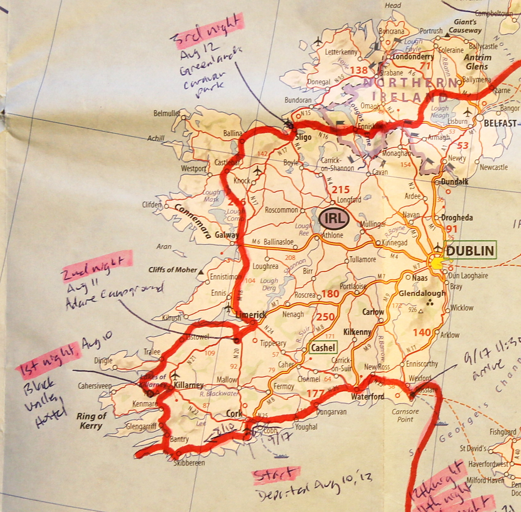 When I finally got to the gas station in Killorglin, it was to discover that I needed 14 liters of fuel (the tank holds 16). Good timing. Once I was out of the Gap, the order of the day was keeping the revs as low as possible. Turns out the SV650 will in fact roll acceptably at 2000 RPM (which is pretty much idle speed), if you're not too concerned about accelerating. The mileage on that tank was 19 km/l. A subsequent tank was 18. Looks like I can more likely expect in the 17-18 range (which puts me at 272 km with an empty tank). With that, the day resolved into a comparatively unremarkable one (once you've accepted that I'm riding a new motorcycle through a country I've only spent about three days in so far). I made a few random stops off my route from Killorglin to Tralee, Tarbert, and finally to Adare, near Limerick. There I stopped into my first real campground. It was So. Much. Better. than the other places I've slept so far. The Adare Caravan and Camping site, in case you find yourself in Ireland, near Limerick, and want a place to set up your tent. A small facility, with 25 spots for caravans and tents, it was quiet, windy and had lovely, level grass. It was the complete opposite of camping at Motofeirme (although to be fair, Motofeirme is not about providing camping facilities). I set up my tent on the lovely, close-cropped grass (with a liberal sprinkling of clover, as if to say, "Yes, you really are setting up a tent in Ireland, buddy"). I laid out my sleeping pad and sleeping bag. I inflated my little pillow. It was all so lovely, and, so inviting... It was only about 6 pm, but a nap just sounded really nice... I woke up a few hours later, thinking I may not have quite beaten jetlag yet. I have to say, though, other than the first morning waking up at 4 am, I don't feel like I'm suffering from jetlag at all. I really think staying up until 10:30 the first night was the trick. I'm amazed. To think, I'm years older than the last time I tried to beat 8 hours' worth of jetlag (my 2010 trip to Germany, where I felt it for several days). I'm impressed. The real trick, of course, was having something absolutely engaging to work on which helped me work through any tired patches on the first day. I actually think my experience working in theater, where I will occasionally find myself up and doin physical work well after midnight probably helped. As I was doing my busywork (keeping track of daily mileage, drawing out my route on my big Europe map as a conversation piece for after the trip, planning the next day to the extent possible), I realized that I had not gone very far to get to Adare: a mere 174 km. If I roll absolutely every day of the trip (which will definitely not be happening, since I'm stopping with friends starting in Wales), I'd have to travel about 160 km every day to cover the distance I need to go. So, 174 was looking pretty skimpy; I was thinking I should be doing more like 250-350 a day in order to have the leisure to stop a day or two here and there. So, for my next day (today, as I write this), I determined to do much more distance. Ireland had only ever figured as a several-day part of the trip, and at this rate, I was likely to take more than a week. I set my sights a bit more aggressively, and aimed for Sligo (which my German-as-foreign-language brain sounds out as "slee-go," but which is actually pronounced "slai-go"). It involved a stretch of motorway (aka, freeway, aka, superslab), but it seemed like a worthwhile compromise to make more distance. Of course, I discovered that it is, in fact, possible to be bored on Irish roads, but no real surprise there. It rained off and on through today's ride. Fortunately it was mostly dry, but I got my first day of rain on the trip. With any luck, this will be an exception rather than a rule. Even though today was to be a distance day (I keep wanting to write "mileage," which doesn't make as much sense when you're thinking in kilometers), I still found a few cool stops. There was a partially-standing monastery (built in the 13th century); there was a tiny pebble beach on Lough Conn; there was probably more that I'll remember after I review photos. Even despite the superslab and the rain, it was a very pleasant day, although by the time I was approaching Sligo and the campsite on Rosses Point my butt was definitely ready to stop. The Greenlands Caravan and Camping Park is beautifully sited right on the point or Rosses Point, although it is also jam packed full of screaming children, so I'm calling it a mixed result. I am even now sitting in the little common room with a blaring television on the Disney channel and about a dozen kids watching as I sit at the little desk with the rent-a-computers. In fact, I think I've had enough, and it's time to head out and take some more pictures and see the greater area, particularly those parts of it which do not contain screaming children. Return to the Europe 2013 page Created by Ian Johnston. Questions? Please mail me at reaper at obairlann dot net. | |||||||||||||||||||||||||||||||||||