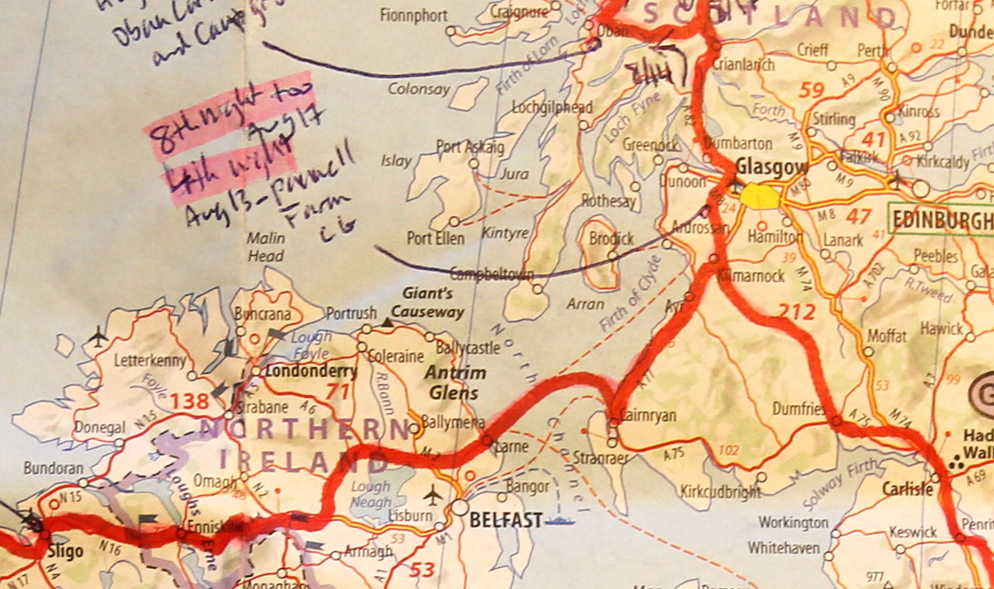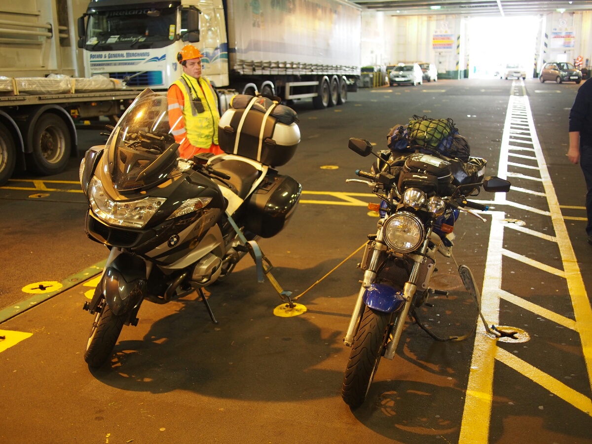 There was perhaps a 20 minute wait for the ferry, during which time I communicated to Martin my findings regarding my speedometer: the dial is in MPH, yet the odometer is clearly incrementing in kilometers. Finally, looking at it from an angle, I saw inscribed along the edge: Redial UK. Obviously some previous owner had had the dial face changed, but couldn't change the odometer units. No big deal, I guess. He said Barry has left, and he's all alone again. I think he likes the built-in social life of having incoming bikers to keep things interesting. I'll be back in around five weeks. We're 20 minutes from our scheduled arrival time at Cairnryan. I hope, if you're interested, you're looking up these places on Google Maps or something like it. I'll have a picture tonight of my in-progress Europe map, and I realized yesterday I actually have a complete GPS track that I should be able to upload at some point, for the ultimate in where-was-Ian voyeurism. (The tracks work well in Google Earth, for instance.) Ok, there's the call, time to pack up. Return to the Europe 2013 page Created by Ian Johnston. Questions? Please mail me at reaper at obairlann dot net. | |||||||||||||||||||||