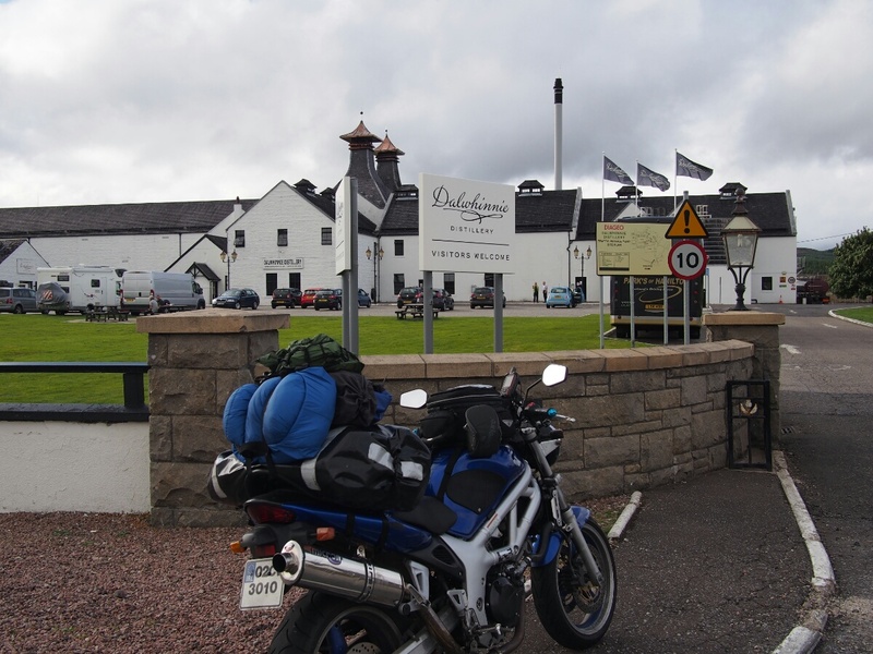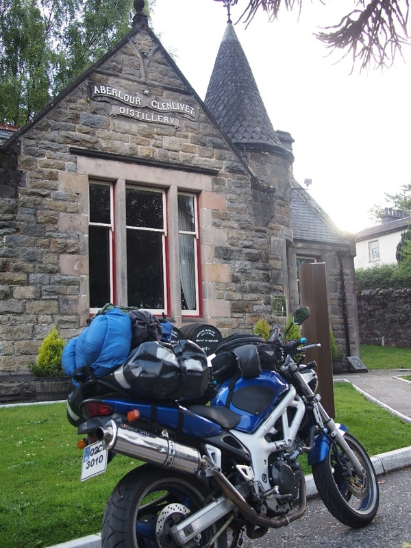I had a mini adventure in Fort William: I saw another motorcycle, heavily laden with touring gear, parked on the sidewalk at the end of High Street. I parked next to it, thinking that must be valid parking. Not so, of course. When I returned, it was to have a parking warden saunter up to me and sarcastically point to the sign (somewhat nonsensically posted on the side of a trash bin) saying "No Parking in this Area" and ask if the sign didn't say, "No Parking in this Area?" I apologized, explained my reasoning, and said I'd leave immediately. That was the plan anyway, but it never hurts to be seen to comply with officers of the law right away. He walked away, apparently satisfied that I was suitably chastized. Before I reached Fort William, I had called the Glenuig Inn, and discovered that they don't have a room free until Sunday night. It's only Thursday today. I was hoping to be headed for Wales by Sunday, so I was feeling at a bit of a loss for what my plan should be. I headed to Fort William anyway, on the theory that it was as good as anywhere else, and I could pick up some groceries and legal chastisement there. Once out of Fort William, I was again at a loss. I wanted to go to Glenuig, and there's no question I will (I might just skip actually staying at the Inn if the timing doesn't work out). But I needed a place to stay for the night, and one thing Glenuig and environs isn't full of, and that's amenities. I briefly considered wild camping, but I think that's an adventure for another trip. I was already on the road to Inverness, so I thought, "Why not?" and headed for Inverness. At some point, I decided to stop being wishy-washy, and formulate an actual goal. So, I set as my goal to find a camping spot in Aberdeenshire, so that I could start visiting Pictish symbol stones. Pictish Symbol Stones 101: they're these carved standing stones, which come in three classes: pre-Christian (class 1), early Christian (class 2) and fully Christian, with no pre-Christian symbology on them (class 3). No one knows exactly what they were for, although there are plenty of theories. The class 1 stones have fascinating symbols on them, some of which are obviously representative of something; some of which, not so obvious. The class 3 stones are where the "Celtic cross" originates, as I recall (they're mostly what you'd recognize as Celtic crosses). I am most interested in the class 1 stones, and hope to visit a number of them tomorrow. I hope that having this goal firmly in mind will help motivate me to get up in the morning. Also, I hope, the complete lack of pounding rain will similarly help motivate me. When I woke up this morning, it was at about 2 am, to the sound of torrential rain on my tent roof. "Well," thought I, "we'll find out for sure how waterproof the tent is, I guess." I drifted back to sleep, but it was troubled, and I didn't sleep well for the rest of the morning. I didn't get out of bed until almost 9 (my alarm is set for 7:30 these days, and I was wide awake when it went off), since every time I thought about it, it started pissing rain again. I figured, if it kept up, I would just amuse myself at the campsite and stay another night -- the last thing I want to do is ride through torrential downpours. Just because I can do it doesn't mean I want to. (By the way: the tent is actually pretty waterproof. Doesn't help to pack it soaking wet, but there wasn't much choice.) So, in order to meet my goal of finding a campsite in Aberdeenshire (I chose Aberdeenshire because I have a map of stone sites that covers this county), I picked a campsite from the map that was more or less in the middle of the county, and set out for it. It was near a town called Tarland. I hope that's like Garland, and not like land-of-tar. Anyway. Headed for Tarland, I topped a rise in the road, and had the oddest feeling of deja-vu: I said to myself, "Dalwhinnie?" Brooke and I stumbled upon Dalwhinnie pretty much by accident last time, on our way from Fort William to somewhere else (probably more or less the same general destination I have now). I'm not sure why, but it really stuck in my mind, and I remember what a depressing little town it was. It was also fairly odd that we stumbled upon it, since it was off on a side-route, and not really on the main drag. And then, sure enough, the next mileage sign listed Dalwhinnie, 5 miles hence. I couldn't not go again. The coincidence of stumbling on this little out of the way town with the spendy distillery product was just too weird. I stopped and took a picture outside the gate (I thought briefly of going in, but really the last thing I need to do is start acquiring breakable bottles of stuff to carry for the next five weeks). Speaking of which, today is my one week-iversary: I landed in Dublin one week ago this morning. Five weeks left, and that's a daunting, daunting amount of riding to ponder. Anyway, on from Dalwhinnie I rode, joining up with the A9. I was following the GPS's directions, which means I frequently find myself going along weird little roads, as it's found the "most efficient" way to get to the destination, rather than the most sensible one. I had missed a turn at one point, because I'd seen Aberlour on a mileage sign, and decided I definitely had to visit that one (Aberlour is "my favorite scotch," in that it's the one that I frequently have on hand). After I missed the turn, I stopped in a picnic area and spread out the map, to see what I wanted to do. I could go for Tarland, or I could run up to the Aberlour distillery and see what I could see. I did some poking around, and discovered that there was, in fact, an Aberlour campsite, so that sounded like a match made in heaven. Every B&B I've passed has had a "no vacancy" sign out, so obviously the weekend vacationers are out. I was a little worried that campsites might similarly be filling up, but the Aberlour Gardens site is only at half capacity or less.