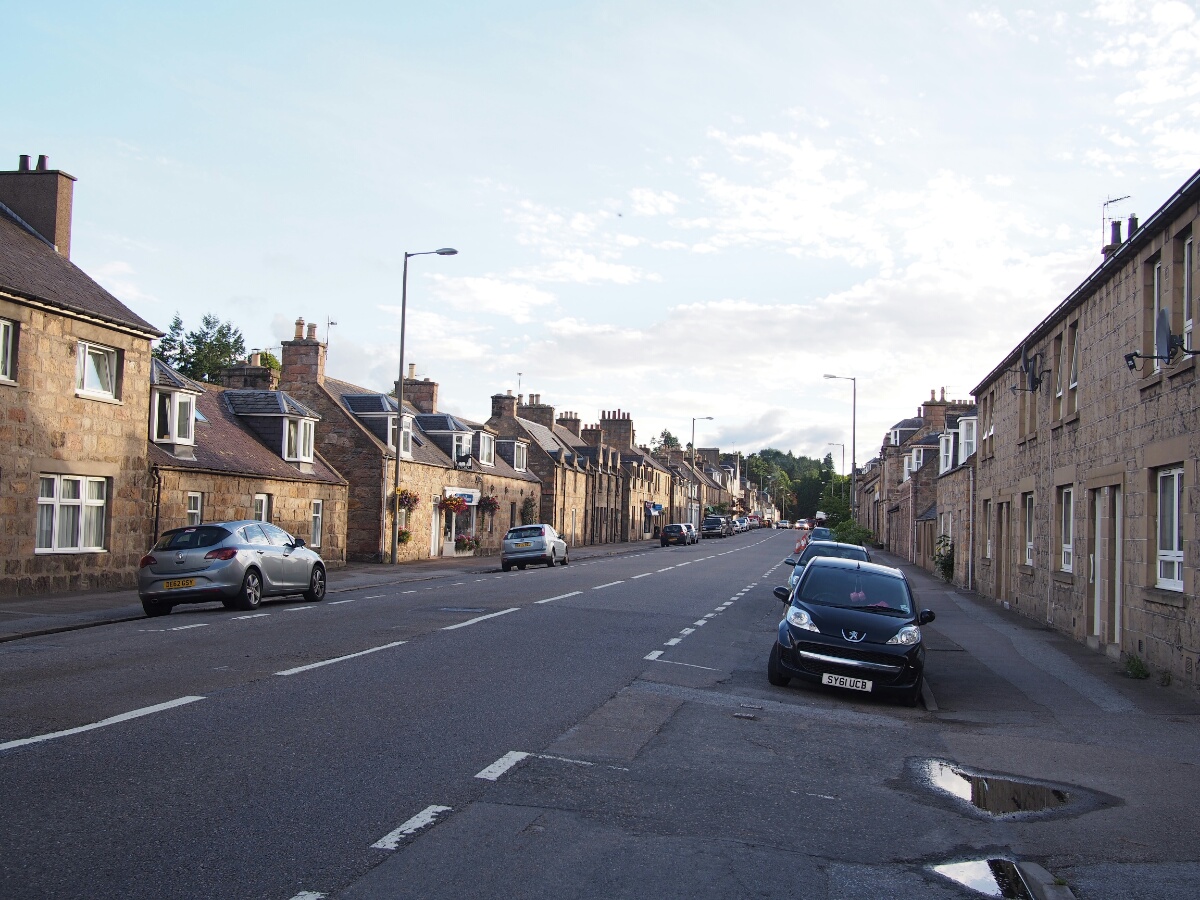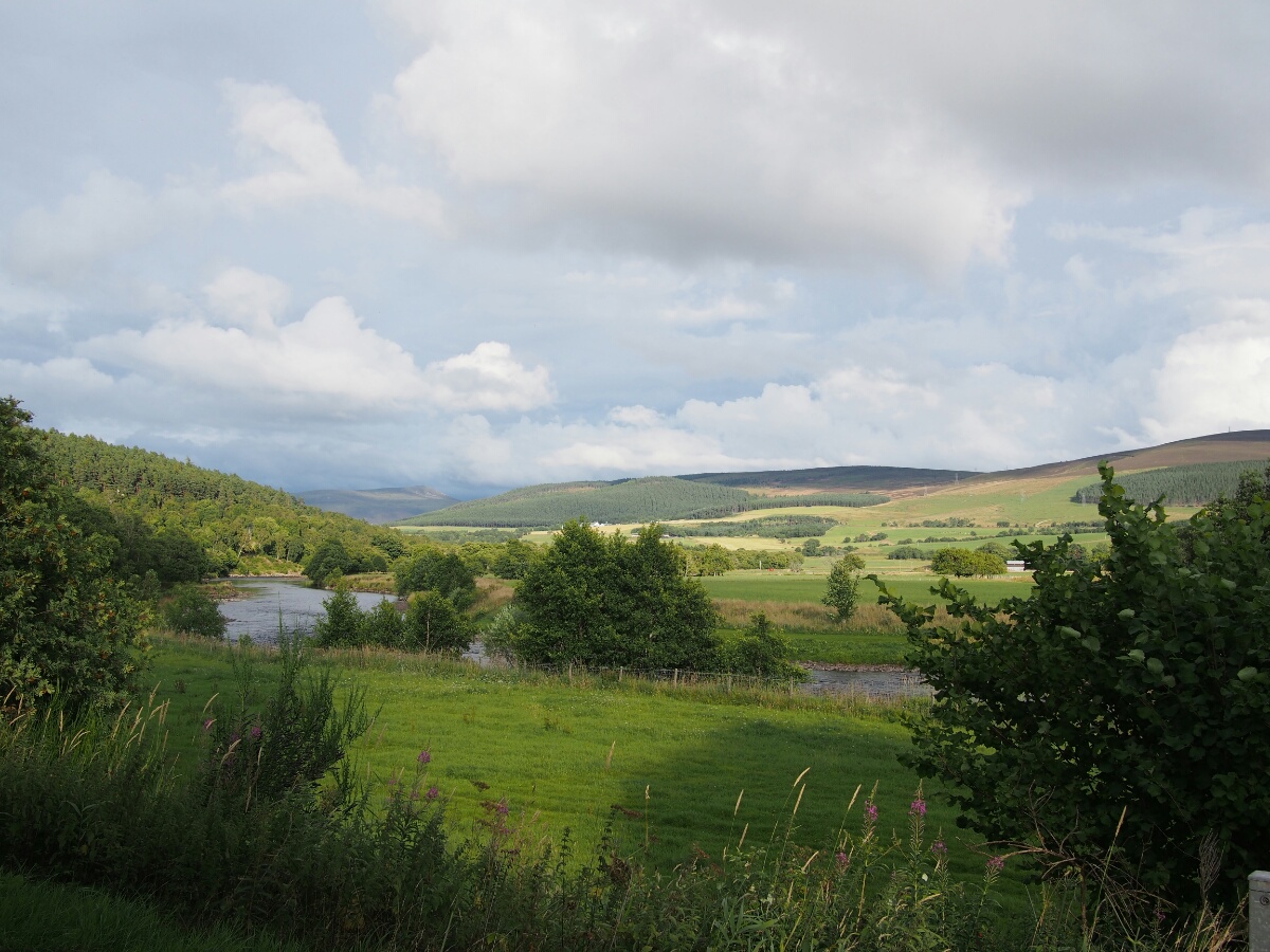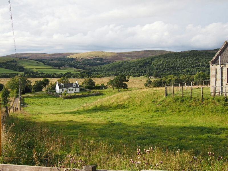I've been stopping a lot to take pictures (the phrase, "When am I going to be by here again?" keeps running through my head, and it's pretty much true -- I also always regret not taking enough pictures after a vacation or trip, so I'm trying to avoid that here). At one point, I took a tiny side road off the primary road I was on (the A9, maybe), intending to turn around and rejoin the highway. However, a delightful thing about the GPS is it will reroute you based on where you're actually going, and it said there was a route forward, on this tiny road. Hell yes, GPS. Take me there! It was maybe a 2 mile diversion from the highway, but it was nearing Golden Hour, and the light was amazing, showing beautifully on valleys and vistas. I must have stopped a dozen times on that tiny road, taking a picture each time, each view making me more and more heart-struck and homesick for a place that's never been home. I spotted a castle across the valley, and realized with joy that my tiny road was going to take me right past it. After several more photo stops, I passed by where I knew it should be, and I looked up, but could only see the spire of the tallest tower from the road. Ah well. I passed a sign a short while later at a driveway, which said something-or-other lodge. It was a modern-looking castle (ie, looked like it had been built in the last 100 years), and my guess is that it was some very rich person's summer home. Eventually I found my way to the Aberlour distillery (almost missing the turn -- all the signs in Scotland seem to give me notice that I've passed a thing, not enough notice to actually slow down and turn there). It was past 7 when I got there, so it was closed, but I stopped and took pictures of myself with the Aberlour sign in the background. It was a handful of very pretty, obviously tourist-focused buildings, and a large number of big, ugly industrial buildings. The site smelled of a variety of very unpleasant things, of which "disgusting toilet" was the most charitable I could name. I suppose the process of distilling fine whisky has to include a bunch of smelly fermentation as well. The cloud cover over me, as the night descends to the braying of hundreds of sheep, is moderate, and these don't look like rain clouds. I'm very hopeful I have a dry evening ahead of me. I didn't make it to Glenuig today, but perhaps I'll make it to a couple symbol stones tomorrow.