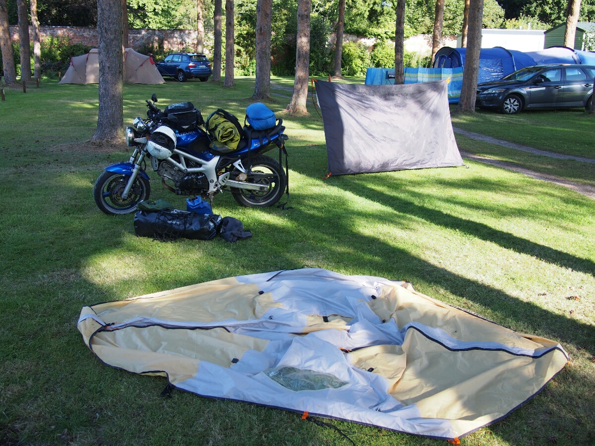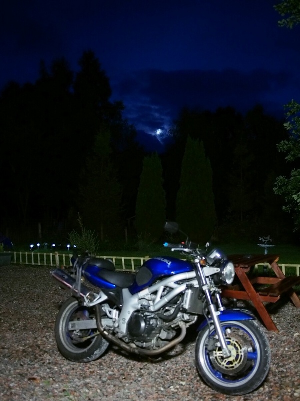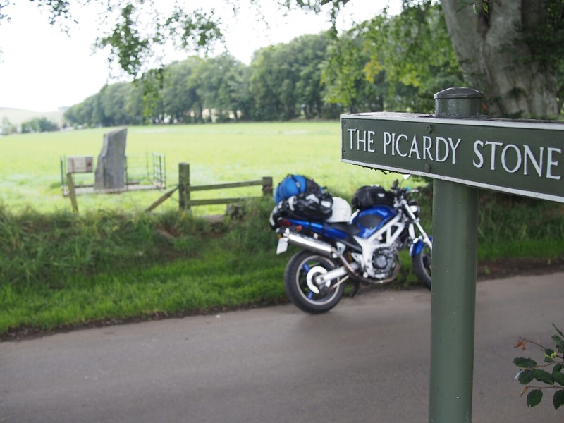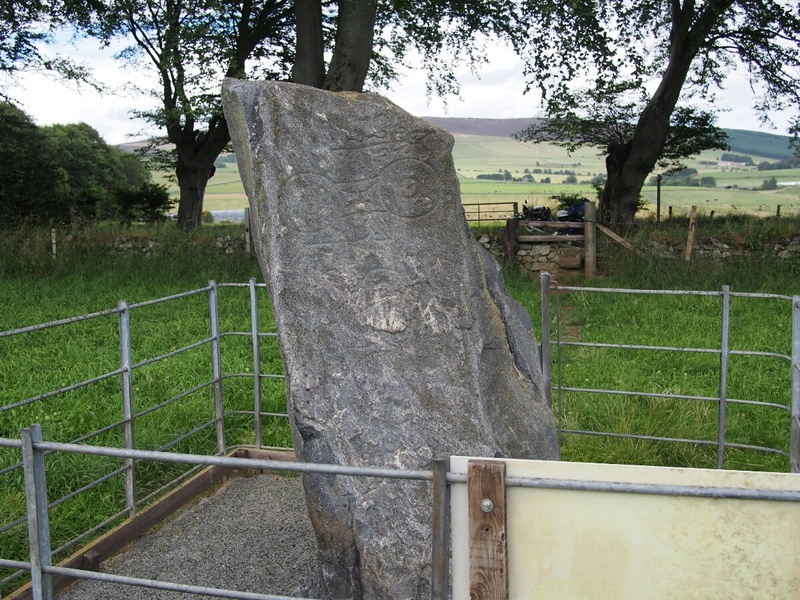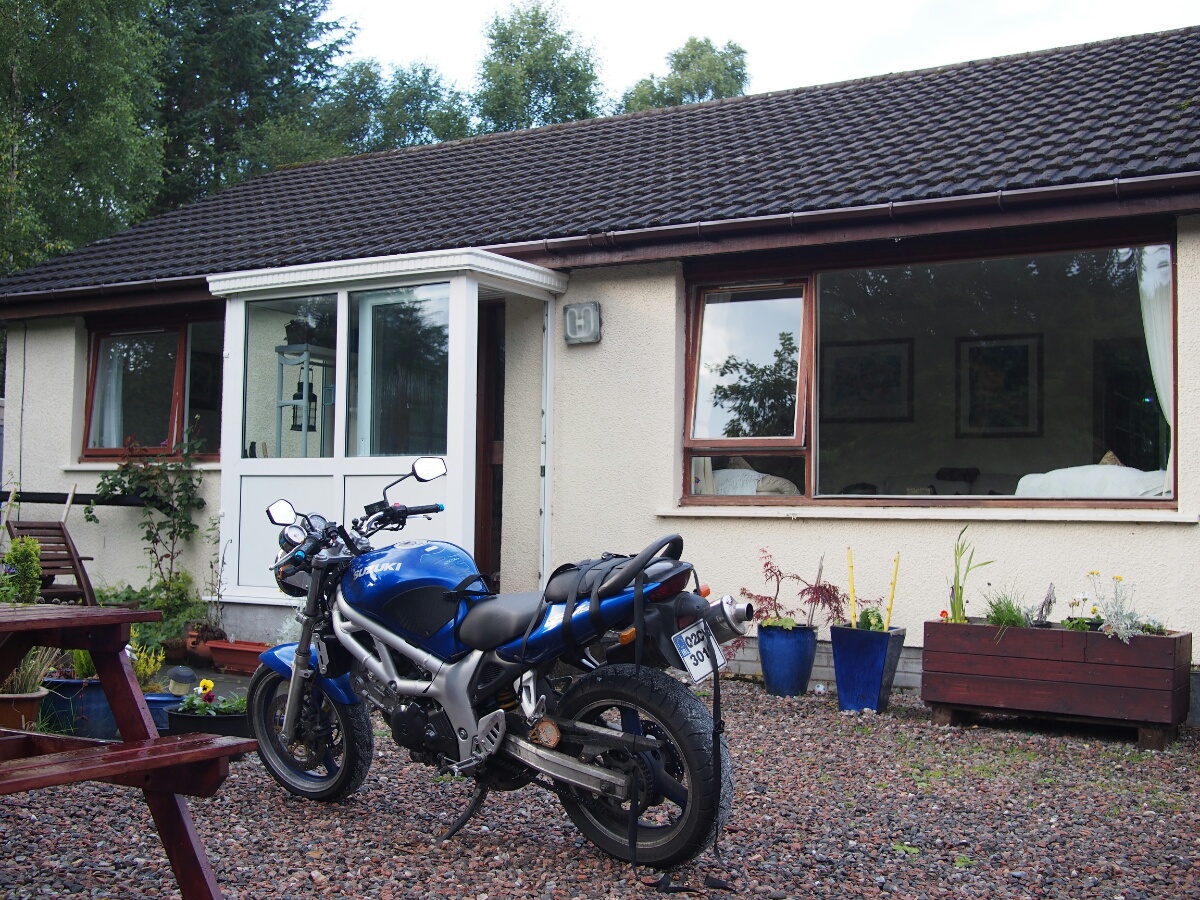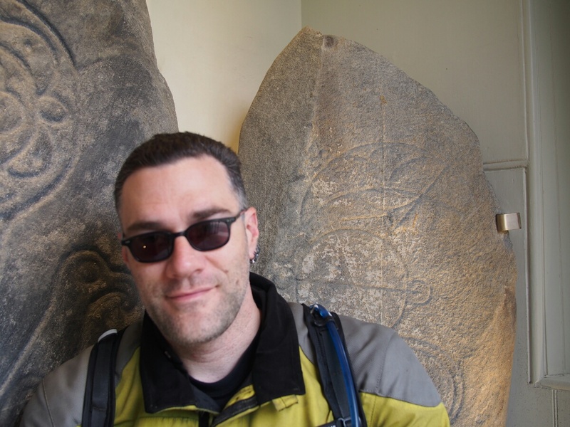 As I type this, I am watching my tent dry out in the sun, which is a welcome change from yesterday, where I just mentally shrugged, and packed up the sopping wet tent in the Oban rain-mist. I've picked out some Pictish symbol stones to visit (two of which are very close to the Aberlour Gardens site I camped at last night). The sheep are still bleating myopically across the valley. After the generally uncomfortable, what-am-I-doing feelings yesterday, I hope today will be better. I'm thinking after visiting the stones today, I'll either end up back here (sheep aside, it's very nice), maybe even spring the five pounds for wifi access, or head for Inverness, where I know there are good campgrounds as well. Let's see what the day brings, shall we? (By the way, major kudos to the Aberlour Gardens campgrond for having both a picnic table, and the weather to permit me to sit down and type at it.) ---- I've landed at The Lodge B&B, a small country house in Roybridge, which situates me well for hitting Glenuig tomorrow. Since discovering that it was booked up through Saturday, I realized that I won't be able to stay there, so I wanted to treat myself to a real bed and a proper shower for at least one night. Considering it costs only seven pounds more than my last tank of gas (about which more later), it seems like a bit of a steal. I departed Aberlour Gardens, after saying my farewells to the kind Swiss couple who allowed me a couple hours' time with their shore power to charge one of my camera batteries, and waving goodbye to the Nottingham couple who chatted with me about cameras the previous night. The campground was about 80% German speakers, from what I could tell. (My ability to speak German came in handy when asking about charging the battery -- I addressed them in English first, and the first thing anyone said was when she exclaimed, "What did he say?" in German.) My first Pictish stone for the day was the one in Mortlach Kirk, in Dufftown (Whisky capital of the world, according to the sign). After wandering around and making a wrong turn or two, I found the right place, but all I could see was gravestones. I wandered the kirkyard for about 20 minutes before a helpful woman across the street yelled down, "The Pictish stone is in the middle!" and pointed. I went in what I thought was the right direction, but eventually had to walk back up and call her attention again. She very kindly walked down with me to point it out. No wonder I missed it, it was in the middle of a row of new-looking gravestones, although it is itself weathered and around 1500 years old. I just didn't see it in the row. This is one of the class 2 stones I mentioned yesterday, early Christian, with both pagan and Christian symbols on it. I found myself vaguely disappointed, since I'd wanted to find one of the earlier class 1 stones. I took a few pictures, but the symbols were well-worn, and quite hard to see in the light we had available. I moved on to my next goal, the stone(s) at St. Peter's Church at Inveravon. This turned out to be easier to find, and I was quickly parked at the church. I found the sign describing the stones, and had to walk around before I found the stones themselves. They'd been moved from the wall of the church, where they'd been suspended for many years, and into a little covered vestibule all their own, including motion-activated lights. I actually exclaimed, "Oh, lighting designers," when the lights clicked on -- they showed the carvings in much better relief than the light coming through the door could. I was standing in front of my first crescent-and-v-rod stone in 17 years. It's the symbol that's always appealed to me, and is the only thing I've ever considered having tattooed on my body. Still thinking about it. It was nice to see one again, and not just a drawing of the symbol on some random website. There is something nebulously profound about actually seeing and touching a stone that was carved so well by a mysteriously vanished warrior race from 500 AD. (The Picts vanished from the historical record around 850 AD; they were either destroyed or assimilated, but all mention of them disappears. This is also just the time Kenneth MacAlpin ascended as the King of the Scots, which had not been a previously recorded job title. Coincidence?) I set up my little tripod and took a few silly pictures of myself in front of the stones, trying to touch them as little as possible, and mostly succeeding (no need to unnecessarily abrade them any more than nature and other people have already done). As I was getting ready to head out again, having had my moment with the stones, I heard an insistent buzzing, like there was a really big mosquito right in the middle of my head. I couldn't figure out where it was coming from, and I contorted and swatted around my head, trying to ward off the insistent insect. Finally, puzzled where the bug was, I looked down the front of my suit, and imagine my surprise (and dancing around and blaspheming) when a giant bumblebee flew out from inside! Amazingly, I didn't get stung. I also can't figure out quite when the little guy could have gotten in there, but I can only assume it was when I was riding, and the only bug strike of a sufficient magnitude that I could remember was perhaps half an hour earlier. Surprising, of course, but clearly it was the power of the Picts protecting me, or something. Obviously. My next stop was the Rhynie stones, which were (mostly) preserved in a little shed in the parking area for another church, in Rhynie. There was yet another crescent-and-v-rod, along with a number of other symbols, all of them pre-Christian as well. There was also a sign describing the stones, and the Picts, that made me reflect a bit. I was going over all googly-eyed over these mysterious symbols, yet they were created by a society which we know to have been both militaristic and aristocratic, two values I pretty much eschew. Why am I so interested in these symbols by 