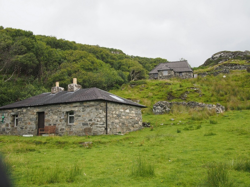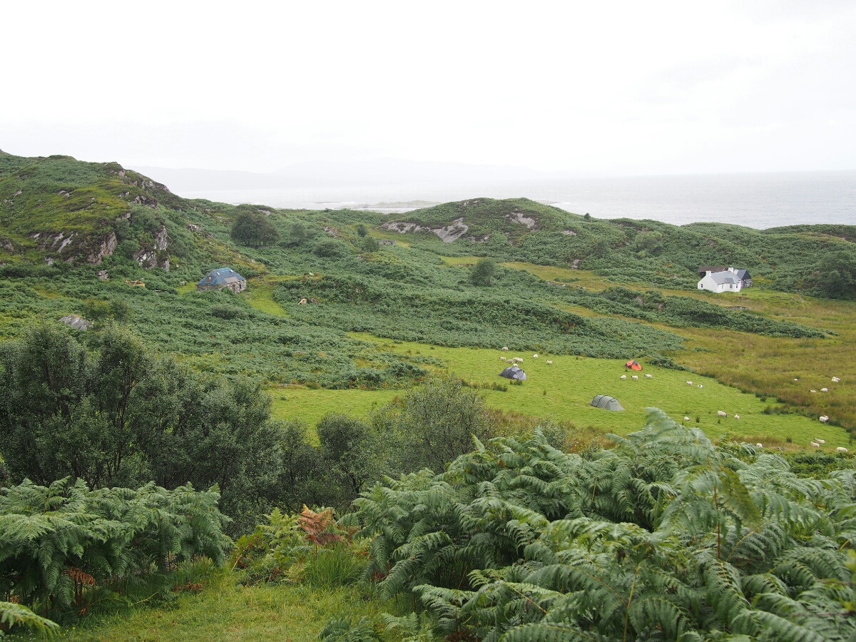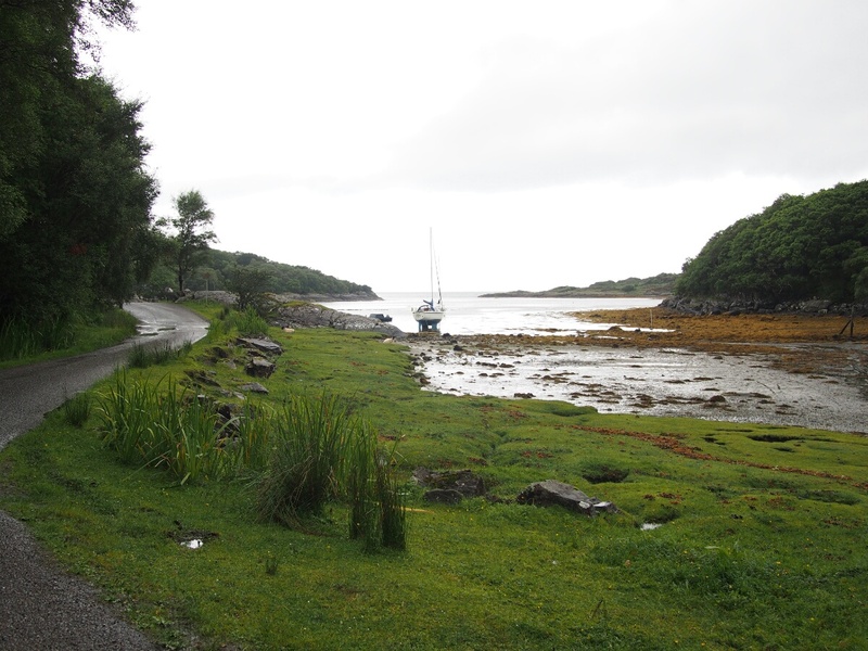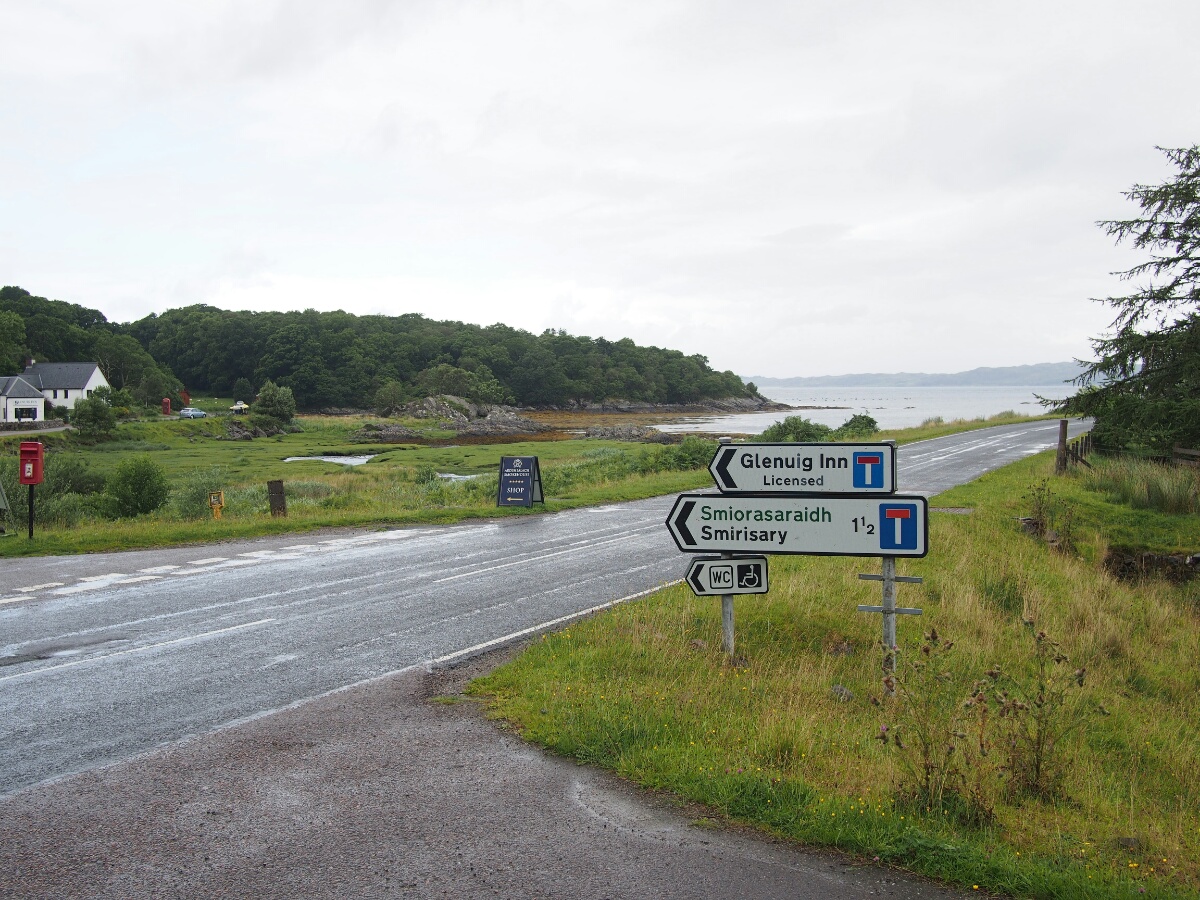 Today started very pleasantly, at the Lodge B&B, in a nice warm bed, sending emails. The included breakfast was ridiculously comprehensive, including yogurt, cereal, fruit, juice, tea, eggs, veggie sausage (the owners, Catherine and Robert, are vegetarian!), toast, fried tomatoes, mushrooms, spinach, zucchini (courgette, I was assured it is called here), waffles, and I'm probably forgetting other stuff. I took pictures, it was so ridiculously delightful. Unfortunately, that was the end of the delight for a while. When I looked outside, it was to the sight of small drops of rain falling in great quantity on the bike. And all indications were that it wasn't going to stop. So, I packed up my stuff and strapped it to the bike with a certain amount of regret. I convinced Catherine to pose for a picture, paid the bill, and headed out in a moment of brighter light that we'll charitably call sunshine. I continued along the road, toward Glenuig. (A correction from yesterday's note: the "little houses" were actually called the Taighean Beaga, not Beagan.) I didn't want to stop for pictures, since there was so much water falling out of the sky. It was after only about five minutes that I felt the first trickle of rainwater running down my leg. The riding suit is ok for moderate rain, but in a real shower, it leaks quite consistently at the crotch. The rain proceeded to get harder and harder. As I made the turn for Mallaig (the nearest big town to Glenuig), it started raining harder. 10 miles along the road to Mallaig, it was raining even harder. I was hunched over the tank bag, hoping to prevent some amount of water from running down my front and thus inside the suit. I am generally far happier to be riding a bike without a fairing, but in moments like this, the weather protection would be awfully nice. The turnoff for Glenuig finally appeared, and I headed down the road toward I knew not what. I had a very clear mental picture of what the village looked like, although it turned out to have been drifting with time, and wasn't terribly accurate. I remembered some of it, but much of it was different from what my memory describes. When I spent my year in Edinburgh, I learned Scottish Gaelic from a professor who had grown up in Glenuig, speaking Gaelic. He brought his students back once a year, for those who were interested, and I took the trip with him. I wish I could remember his name, but I haven't a clue what it was now. In any case, I visited Glenuig then, with the student group, and then Brooke and I returned at Easter to stay a night or two at the Inn. When Brooke and I were there, we were eating dinner at the Inn, and unbidden and unexpectedly, musicians started showing up, and just started playing for their own enjoyment. We got a free and authentic Celtic music concert just because of where we happened to be. It was amazing. In any case, I found the shop (now open from 2-4 pm most days, closed Wednesdays -- I recalled it only being open on Tuesdays and Thursdays) exactly where I'd remembered it, and the road out of town was as I recalled it, but there were more houses around than I'd bothered to remember (I think they were there all along, but I was choosing to remember the place as being more isolated than it actually is). The Inn was much as I'd remembered it, although the rooms off to the left were connected, and I vaguely recalled them being a series of tiny cabins. I didn't actually stop in to the Inn, at first. First, I wanted to go to Smirisary, which is a miniscule fishing village directly west of Glenuig. This was where I recall Brooke taking a cool picture of me in sunset light, with these amazing upthrusting stones in the background. I really wanted to find the place again. The village itself (more properly a collection of perhaps half a dozen cottages) is only accessible by a half-mile-long footpath which, when I finally traversed it, was acting the part of ersatz streambed and mud factory as well. Before I went down, I actually climbed to the top of a small hill near the parking spot I'd picked, and just kind of looked around. The rain had tapered off, and it was very nearly not raining at this point. The view was barren and beautiful and a little bit like something from a dream. I had built up Glenuig and Smirisary as this kind of highlands nirvana in my head, and seeing it again for real was like walking into a dreamscape formed into actual landscape. I debated, and actually had my helmet on, ready to ride away, before I realized I was being silly, and I hadn't come all this way to avoid the short walk to the village -- I didn't see the path, and was feeling out of sorts between the rain and the weird emotions hovering at the edge of consciousness. I had been moments away from riding away dejectedly, convinced that it was a bad idea to spend the extra five minutes finding the footpath to the village. Fortunately, I did realize I was being silly, and grabbed the camera and tripod, and started walking. Luck was with me, and there was a gent loading his car, who directed me to the path; I started up. The path is like something out of a fairy tale, reinforced with stones to provide somewhere to step in the mud, doubtless that reinforcement put in place hundreds of years ago. It winds through a forest that I can only describe as a fairy glen (hopefully I'm caught up with pictures by the time I send this, so you can see what I'm talking about). The path opens into the field which makes up the village next to one of the cottages, a tiny stone building, maybe 200 square feet. From there, you're free to wander down through a field full of sheep and a few tents, as there are no set paths. Through a large section of tall grass, to another field, down past another cottage (this one occupied, with the residents studiously ignoring me through their glassed-in porch), to a beach made up of large stones, ranging in size from a clenched fist to a large loaf of bread. There, beside the stone bea