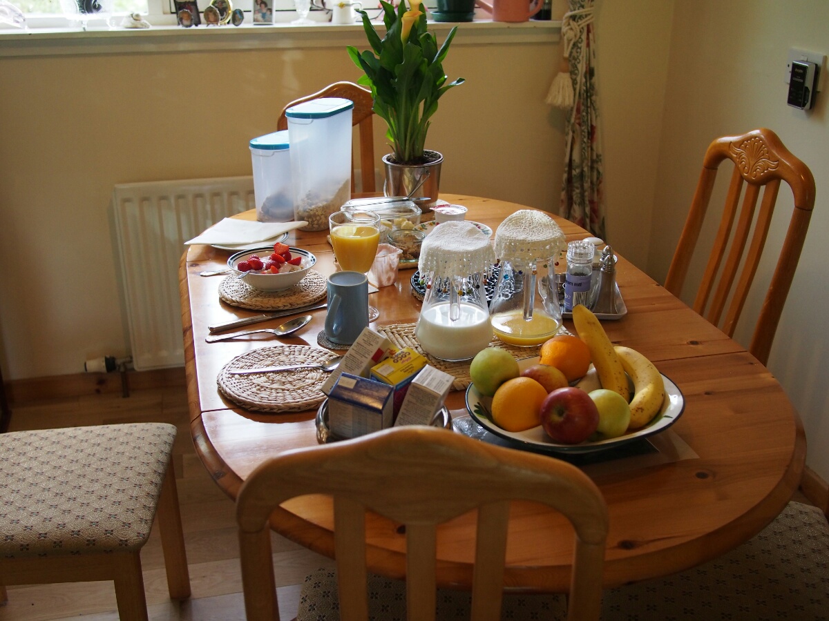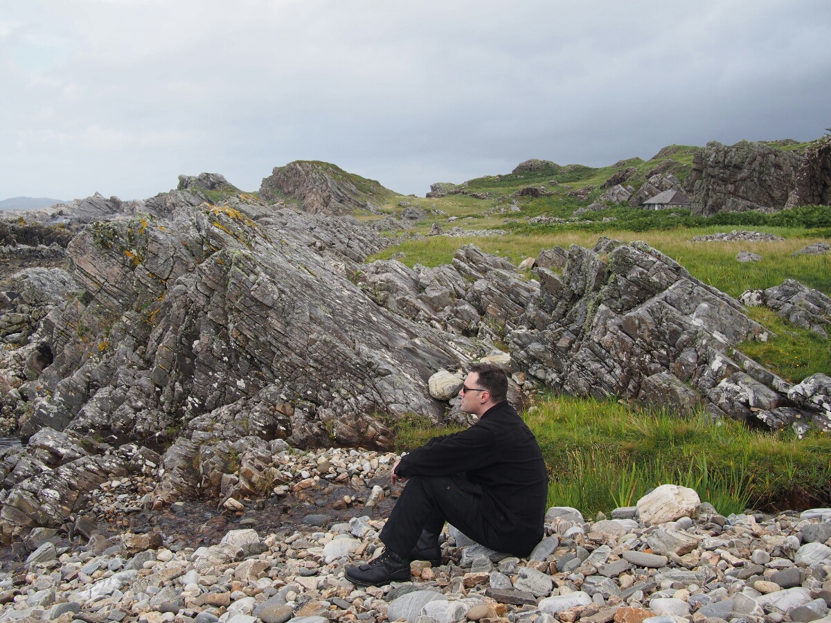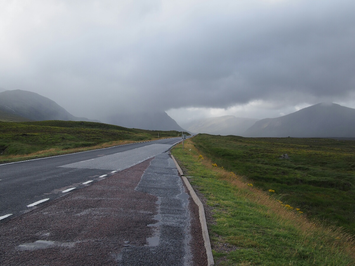 Today started very pleasantly, at the Lodge B&B, in a nice warm bed, sending emails. The included breakfast was ridiculously comprehensive, including yogurt, cereal, fruit, juice, tea, eggs, veggie sausage (the owners, Catherine and Robert, are vegetarian!), toast, fried tomatoes, mushrooms, spinach, zucchini (courgette, I was assured it is called here), waffles, and I'm probably forgetting other stuff. I took pictures, it was so ridiculously delightful. Unfortunately, that was the end of the delight for a while. When I looked outside, it was to the sight of small drops of rain falling in great quantity on the bike. And all indications were that it wasn't going to stop. So, I packed up my stuff and strapped it to the bike with a certain amount of regret. I convinced Catherine to pose for a picture, paid the bill, and headed out in a moment of brighter light that we'll charitably call sunshine. I continued along the road, toward Glenuig. (A correction from yesterday's note: the "little houses" were actually called the Taighean Beaga, not Beagan.) I didn't want to stop for pictures, since there was so much water falling out of the sky. It was after only about five minutes that I felt the first trickle of rainwater running down my leg. The riding suit is ok for moderate rain, but in a real shower, it leaks quite consistently at the crotch. The rain proceeded to get harder and harder. As I made the turn for Mallaig (the nearest big town to Glenuig), it started raining harder. 10 miles along the road to Mallaig, it was raining even harder. I was hunched over the tank bag, hoping to prevent some amount of water from running down my front and thus inside the suit. I am generally far happier to be riding a bike without a fairing, but in moments like this, the weather protection would be awfully nice. The turnoff for Glenuig finally appeared, and I headed down the road toward I knew not what. I had a very clear mental picture of what the village looked like, although it turned out to have been drifting with time, and wasn't terribly accurate. I remembered some of it, but much of it was different from what my memory describes. When I spent my year in Edinburgh, I learned Scottish Gaelic from a professor who had grown up in Glenuig, speaking Gaelic. He brought his students back once a year, for those who were interested, and I took the trip with him. I wish I could remember his name, but I haven't a clue what it was now. In any case, I visited Glenuig then, with the student group, and then Brooke and I returned at Easter to stay a night or two at the Inn. When Brooke and I were there, we were eating dinner at the Inn, and unbidden and unexpectedly, musicians started showing up, and just started playing for their own enjoyment. We got a free and authentic Celtic music concert just because of where we happened to be. It was amazing. In any case, I found the shop (now open from 2-4 pm most days, closed Wednesdays -- I recalled it only being open on Tuesdays and Thursdays) exactly where I'd remembered it, and the road out of town was as I recalled it, but there were more houses around than I'd bothered to remember (I think they were there all along, but I was choosing to remember the place as being more isolated than it actually is). The Inn was much as I'd remembered it, although the rooms off to the left were connected, and I vaguely recalled them being a series of tiny cabins. I didn't actually stop in to the Inn, at first. First, I wanted to go to Smirisary, which is a miniscule fishing village directly west of Glenuig. This was where I recall Brooke taking a cool picture of me in sunset light, with these amazing upthrusting stones in the background. I really wanted to find the place again. The village itself (more properly a collection of perhaps half a dozen cottages) is only accessible by a half-mile-long footpath which, when I finally traversed it, was acting the part of ersatz streambed and mud factory as well. Before I went down, I actually climbed to the top of a small hill near the parking spot I'd picked, and just kind of looked around. The rain had tapered off, and it was very nearly not raining at this point. The view was barren and beautiful and a little bit like something from a dream. I had built up Glenuig and Smirisary as this kind of highlands nirvana in my head, and seeing it again for real was like walking into a dreamscape formed into actual landscape. I debated, and actually had my helmet on, ready to ride away, before I realized I was being silly, and I hadn't come all this way to avoid the short walk to the village -- I didn't see the path, and was feeling out of sorts between the rain and the weird emotions hovering at the edge of consciousness. I had been moments away from riding away dejectedly, convinced that it was a bad idea to spend the extra five minutes finding the footpath to the village. Fortunately, I did realize I was being silly, and grabbed the camera and tripod, and started walking. Luck was with me, and there was a gent loading his car, who directed me to the path; I started up. The path is like something out of a fairy tale, reinforced with stones to provide somewhere to step in the mud, doubtless that reinforcement put in place hundreds of years ago. It winds through a forest that I can only describe as a fairy glen (hopefully I'm caught up with pictures by the time I send this, so you can see what I'm talking about). The path opens into the field which makes up the village next to one of the cottages, a tiny stone building, maybe 200 square feet. From there, you're free to wander down through a field full of sheep and a few tents, as there are no set paths. Through a large section of tall grass, to another field, down past another cottage (this one occupied, with the residents studiously ignoring me through their glassed-in porch), to a beach made up of large stones, ranging in size from a clenched fist to a large loaf of bread. There, beside the stone bea