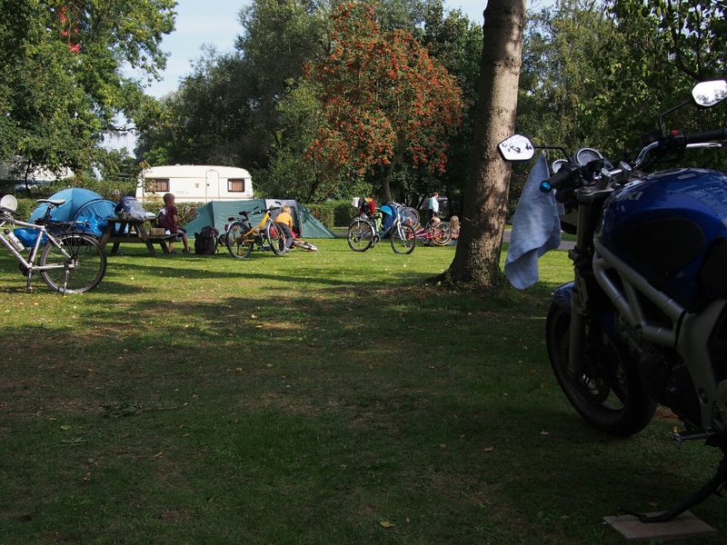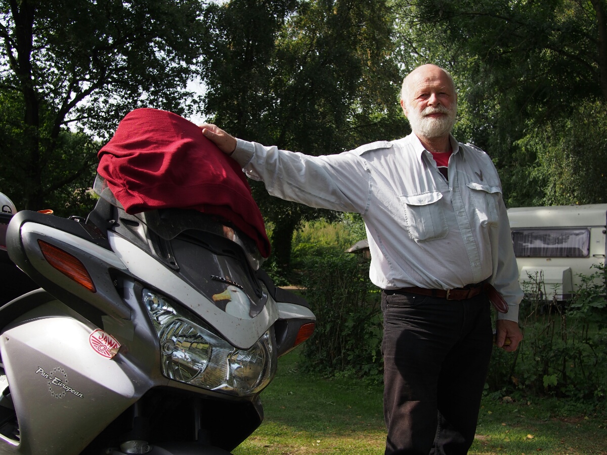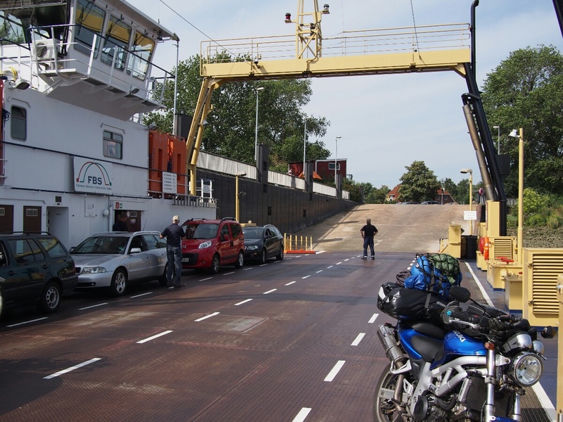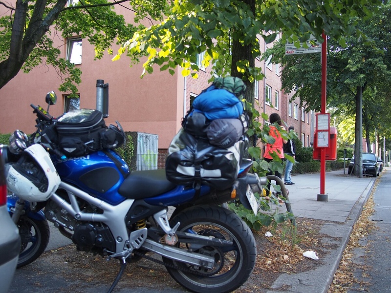 Europe 2013: Into HamburgAugust 25, 2013 The morning lived up to the evening's promise, and I woke up gradually and pleasantly to the sound of the wind rushing in trees. After getting up, I got to see the "motorcycle factory" opposite my tent where children were busily installing cardstock from various sources to rattle against their spokes. Some of them sounded quite credible. Renee and I shared a bench for breakfast, this being the first campsite which offered delivery of bread -- I got a Kaesebroetchen and a chocolate croissant, which was mis-delivered as a regular croissant -- including his raspberries and blueberries. We talked about an eclectic variety of topics, including trees and what they're called, his family and the misadventures of one of his sons, who went to India and engaged in "dangerous yoga," on which topic I wasn't too clear. Again, we spoke mostly in German, with occasional switches to English when we couldn't think of a particular word. It was very pleasant. I took his picture before setting off, and I suspect he took a much more serious pose than how he presented himself in conversation. My distance tally today was quite small, as I only had to go from Bremen to Hamburg, which is a short trip. As I left the campsite (which really was lovely -- if you find yourself in the Bremen/ Bremerhaven/Hamburg region, "Campingplatz Juliusplate" is recommended) by 11, and didn't need to be in Hamburg until 7, I had plenty of time to take my time. Really, I needed it. The chain made worse and worse noises the whole way, and I was extremely glad when I landed in Hamburg, and could park the bike. I'll call up a couple repair shops tomorrow and see if I can get a new chain installed, and ask them to test the output shaft bearing. I rode today like I was on eggshells, since I didn't want anything nasty to happen with the chain. After discussion with Renee, he recommended, and I went to the little tiny ferry across the river, which cost 2.50 and was quite charming, in a sort of efficient German way. The ramps were cleverly set up, so that the flow of the river would always orient the boat correctly as it came in. I was a little surprised to see that it didn't use a crossing rope or chain, but realized that kind of thing must not be acceptable on a river with normal shipping traffic on it. On my way through, just as I was trying to decide how to spend the idle part of my day (the ride was only about 3 hours, and I had 8 to work with), I chanced upon a couple riders by the side of the road. One of them was lying on his side, clearly working on his bike, an old vintage 50cc bike that would turn out to be a beautiful red Kreidler with a sticker on the side that said, "Kreidler: Fastest 50cc bike in the world: 210 km/h." If that's right, that's ridiculously fast for a 50cc motorcycle, and I wouldn't even have thought it possible. In any case, I stopped, and offered what little help I could. After about 10 minutes, we'd worked out that the most useful thing I could do would be to take this gent's phone number up to the vintage bike meet he was supposed to be attending, and see if I could convince them to send help. I bade him good luck, and headed out. Thus did I come across the Old-Timers Treff of the NSU Quickly club of Bexhoevede. The NSU Quickly is a bicycle-with-motor that was introduced after WWII, when the vast majority of the German population was desperately poor, but in need of transportation. Bicycles were around, and strapping a motor to a bike is a simple and cheap way to get people moving. I looked around and tried to find help for my gent, but it was surprisingly hard to come across. The meet was comparatively tiny, but there were still a few hundred people there, and the few I approached had a fairly negative attitude, consisting of "why should I shift myself to help him, he'll probably be gone when I get there," which I found quite discouraging. I'm hoping that the help he'd been expecting when I left was in fact the two motorcyclists I saw going his way on tiny vintage bikes, otherwise he may still be stuck out there. As there was nothing else I could do to help, I took a look around and snapped a few pictures. I got myself a fish sandwich (why pass up a cheap lunch?), and headed out. The whole adventure with Horst (the gent with the Kreidler motorcycle) had taken an hour and a half or so, and I realized that I should probably orient myself towards Hamburg, so I wouldn't put too much unnecessary strain on the ailing chain, and not arrive too late. The rest of the drive was ridiculously pretty, with north Germany putting on its best weather for me: puffy clouds gently traversing the sky, gentle wind, slightly more than room temperature. This, combined with a careful avoidance of thought about the chain, resulted in a completely lovely ride to Hamburg. Once there, I was directed through a large industrial district, with lots of little finicky turnings. After I achieved a more city-like environment, I was also surrounded with a whole bunch of coincidentally-together motorcycles. It just happened that about 5 different groups and individuals came together on the Sunday-evening streets of Hamburg for a little thunder-fest. The other bikes were all cruiser-style bikes, some of them clearly heavily customized, with super fat rear tires and perfectly clean lines. A few minutes later, I was pulling up to my friend Lissen's address (some of you may have met her when she was in Seattle a couple years ago: my German friend with the reddish-brown hair). I spent a little while reading, as I was early, and then rang up to her apartment. At this point, we have just returned from our dinner of pan-Asian food at a place a few blocks away, and have had a good conversation on a variety of topics. Tomorrow, I begin my bike-repair adventure, and then we have a couple of days of hanging out to look forward to. Most pleasing! Return to the Europe 2013 page