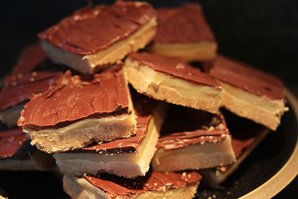 - Once set, cut the caramel shortbread into bite-size pieces. The